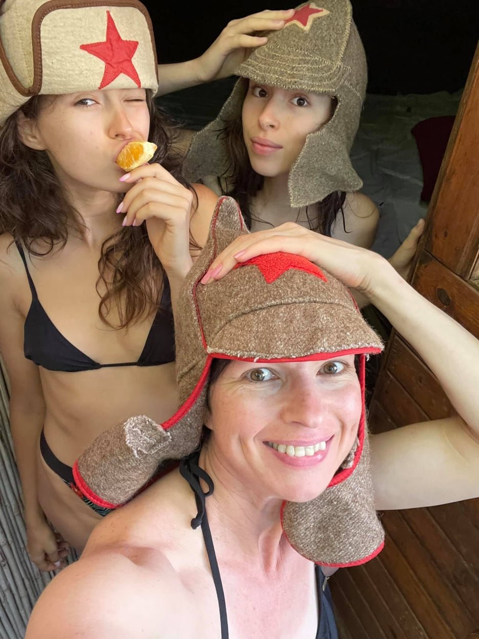 בזמן שז'ניה ואני שכבנו על קרשי עץ ונשמנו ריח של עץ רטוב וארומה של אקליפטוס, אריאל היה איתנו, מדבר על האפשרויות של גופנו, על היתרונות של טמפרטורה גבוהה ומדי פעם נפנפו אותנו במטאטאים על הישבן ועוד חלקים מהגוף.